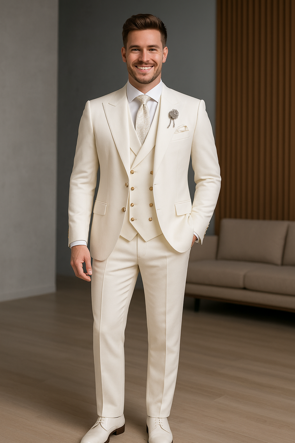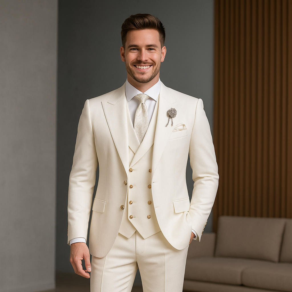 Men's Business Formal Partywear Off White Color 3 Piece Suits