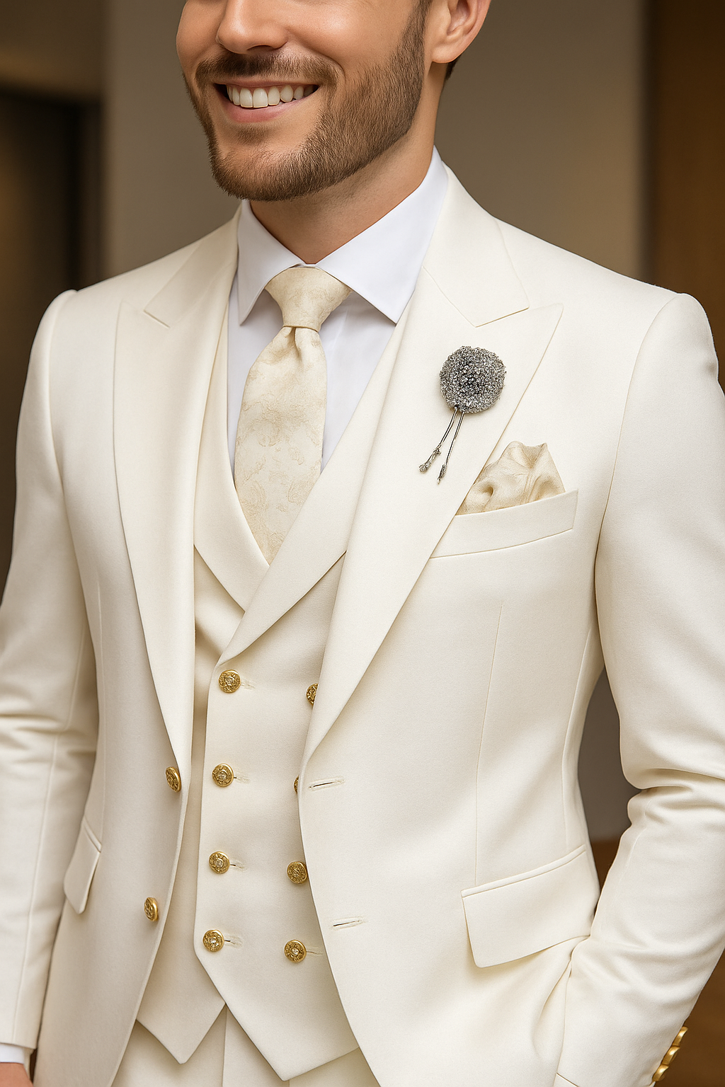 This Men's Business Suits Designer Wedding Dinner Party Wear Suits is the perfect choice for any special occasion. The Off White color adds a touch of sophistication, while the designer craftsmanship ensures a perfect fit. Make a lasting impression with this special gift for him.